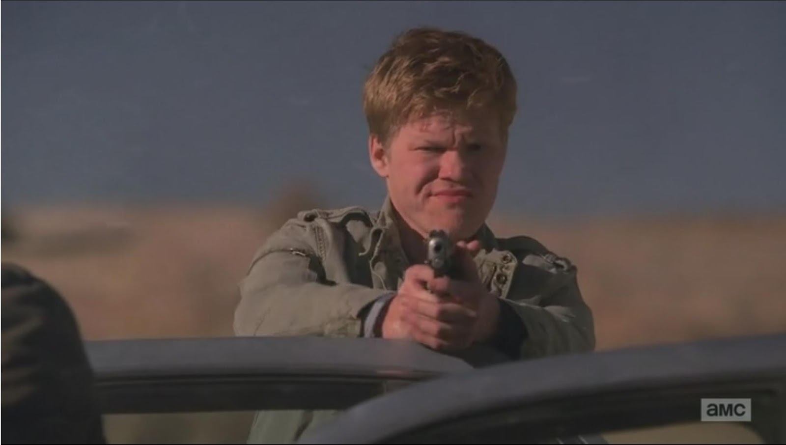 “To’hajiilee” concludes with a hell of a cliffhanger. It leaves in mid-action. Somebody is probably going to die now, but it leaves us with no indication as to who. Or maybe the more tragic part about is that we know Walt will definitely survive, thanks to those flash forwards. Once again, I see a connection to “No Country for Old Men”: Walter White is Anton Chigurh. Like Chigurh, he is a grim reaper figure who manages to walk out of every horrific incident he gets into unscathed. He will then be forced to walk the Earth, as a reminder that evil will always exist in the world. I’m getting dark here, but my point is that only fate (cancer) can kill Mr. White at this point.